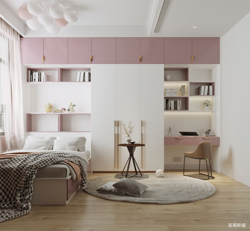 桌柜一体接壤设计,绚丽与沉稳相互衬托,足以达到空间最好的状态。饱和又柔润的色块,整齐坐落于床体柜身,通过极简规划分配,刻画出完美的实木纹理。造型独特的床前灯,像一抹阳光照进心扉,散发着童真与梦幻的味道,形成了独有的轻奢精致感。