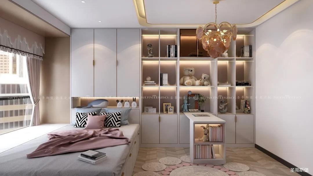 定制柜独特设计满足了女儿对卧室的功能需求,一字型定制柜挑出台面设计,直接打造便利书桌,视觉上将空间分割成两个不同的趣味空间,实现了一房多用,简直完美!