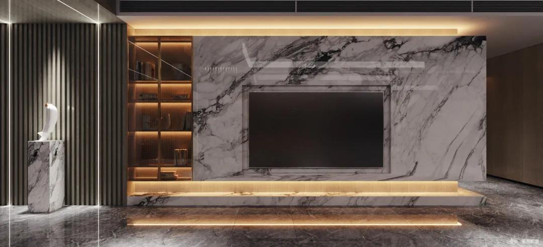 为了减轻现代都市工作的忙碌,客厅设计更偏向于对生活“解压”的极简,精选自然纹理的大理石与实木定制柜做一体化设计,并在电视背景墙下半部分做挑空设计,安装个性十足的线性灯带,延伸客厅视觉深度。