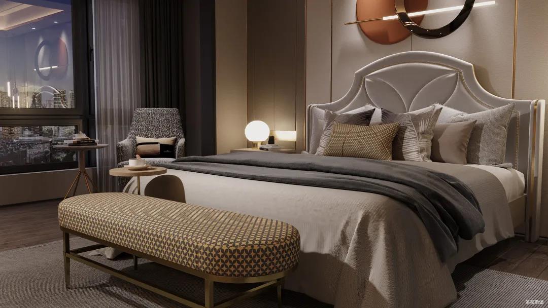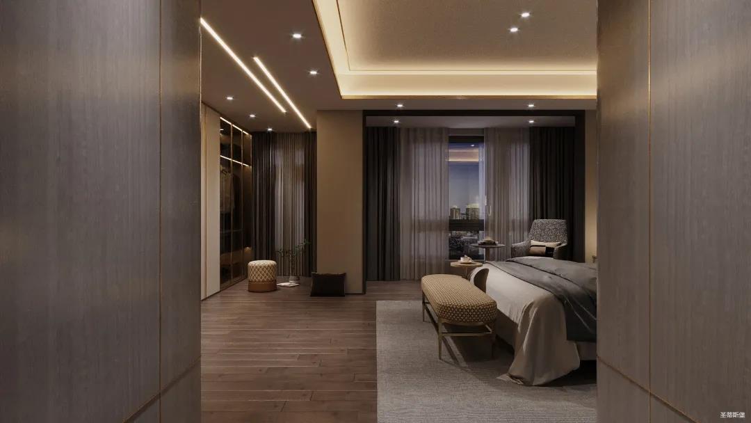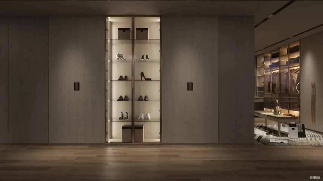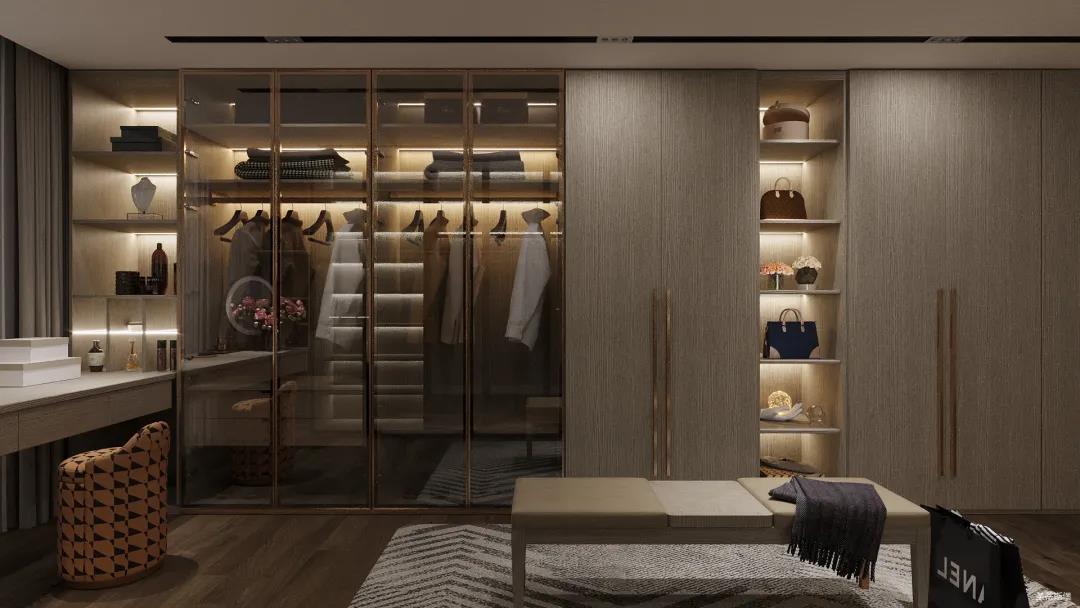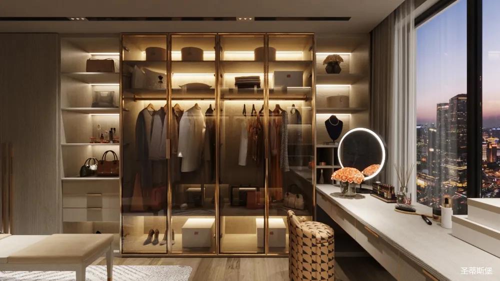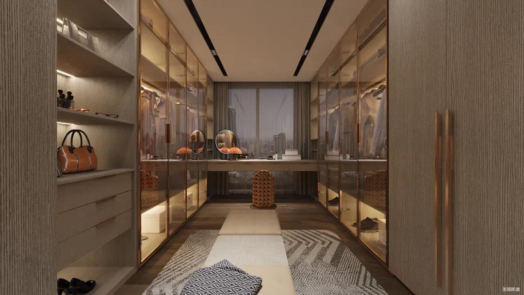 移步衣帽间,精简华丽几乎贯穿了整个空间,质感高级的实木定制柜框架、通透明亮的玻璃展示区、色调醇厚的金属镶边,每一项细节搭配都在强调着业主的高端品位。妆台前的落地窗让我们在观赏都市繁华的同时也屏蔽了都市喧嚣,让我们置身于繁华都市中有一处宁静休憩地。