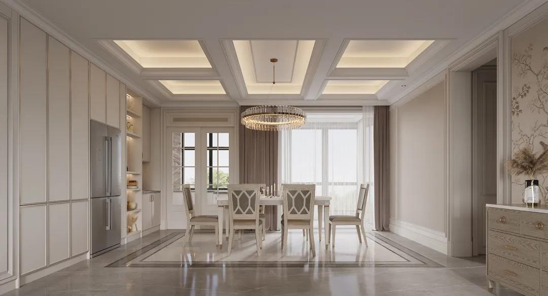 在华丽而精致的餐厅中,仿古白的餐桌椅搭配通透的水晶高脚杯,两者交相辉映,用餐仪式感十足。墙面的护墙板和酒柜呈现一字型设计,一方面增添空间整体的丰盈感,还强调出个性现代的轻奢布局。