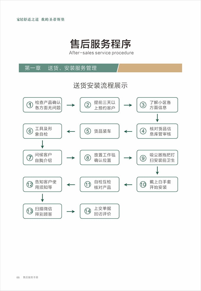 话术参考:“**先生/女士您好,我是米兰·(milan)中国官方网站的售后服务人员**,您购买的米兰·(milan)中国官方网站家具已经全部到货了,送货安装大约需要**时间,请问您这边什么时候方便我们上门送货安装呢?”同时要了解送货小区的电梯、楼道、入户门的尺寸等,提前做好准备,避免意外情况。最后确定送货时间(安装所需要时长),并告知客户安装人员的相关信息,可加微信发送,并发送配送安装流程说明。