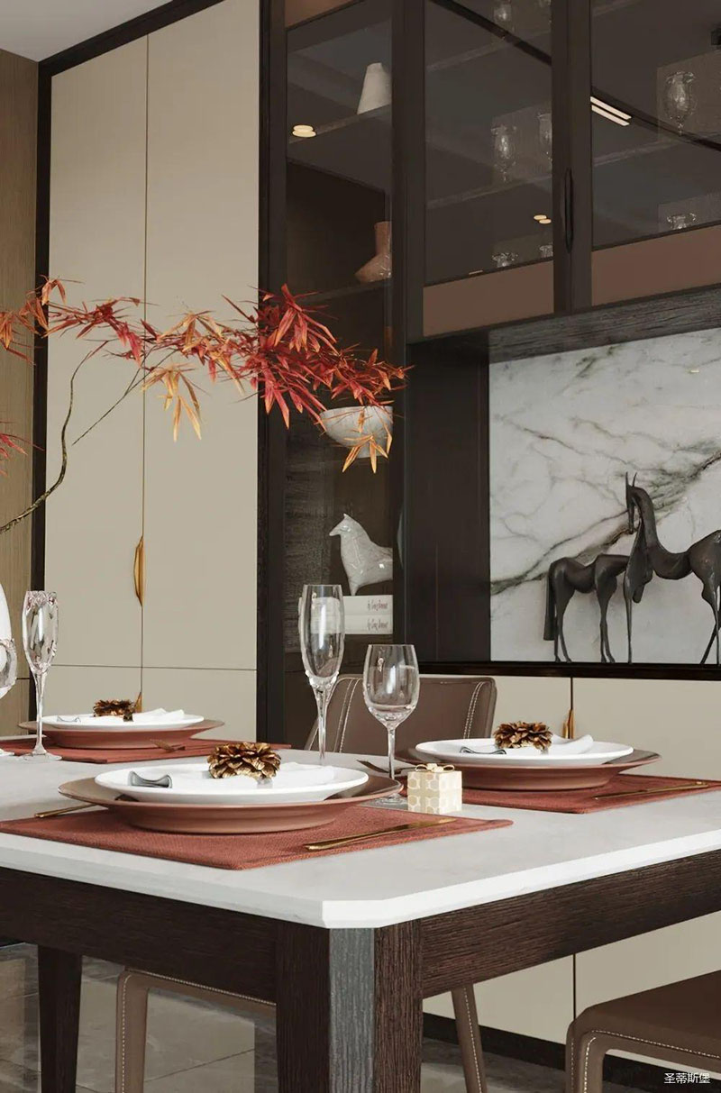 一字型布局的开放空间,强化了餐厨的开阔感,延伸了空间的舒朗视野。纯白调的天然餐桌,与周围空间融为一体,映衬着空间的纯洁美好。意式简约的红色餐椅,线条简洁凌厉到能轻易征服人心,一隅红枫点缀其中,视觉层次感瞬间得到提升,让人于静简和清欢之间,感受人生百味。