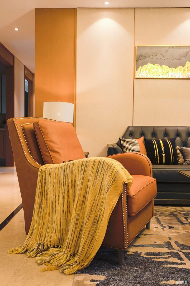 爱马仕橙的休闲椅是空间的点睛之笔,相对于霸气沉稳的墨绿双人沙发,它更为时尚摩登,两者合理搭配,赋予了空间阳刚与柔情并存的意境。