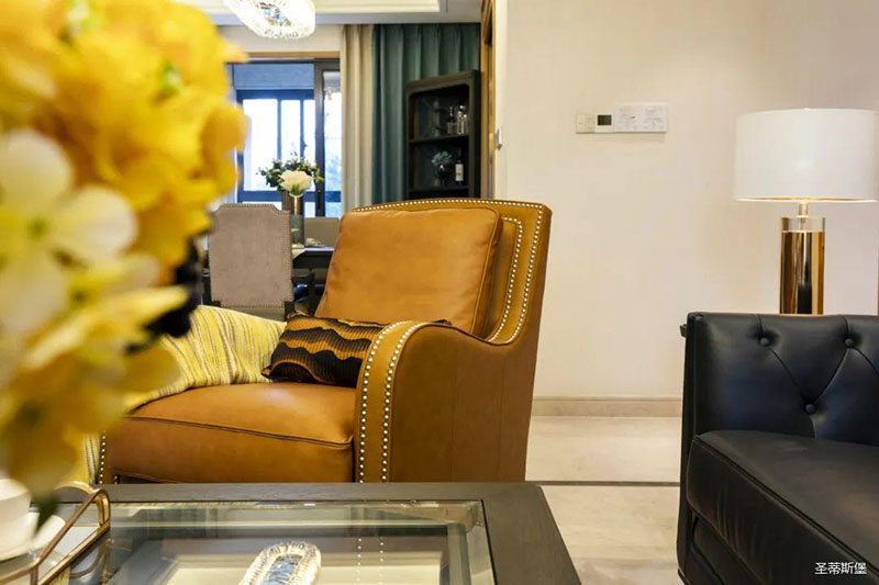 极具时尚设计格调的透明茶几,不仅中和了沙发的厚重感,还令空间更为清透明亮!