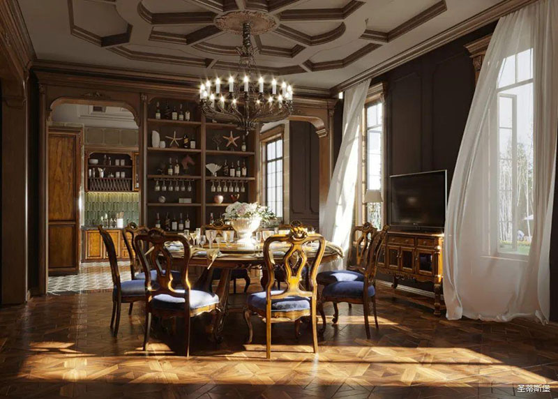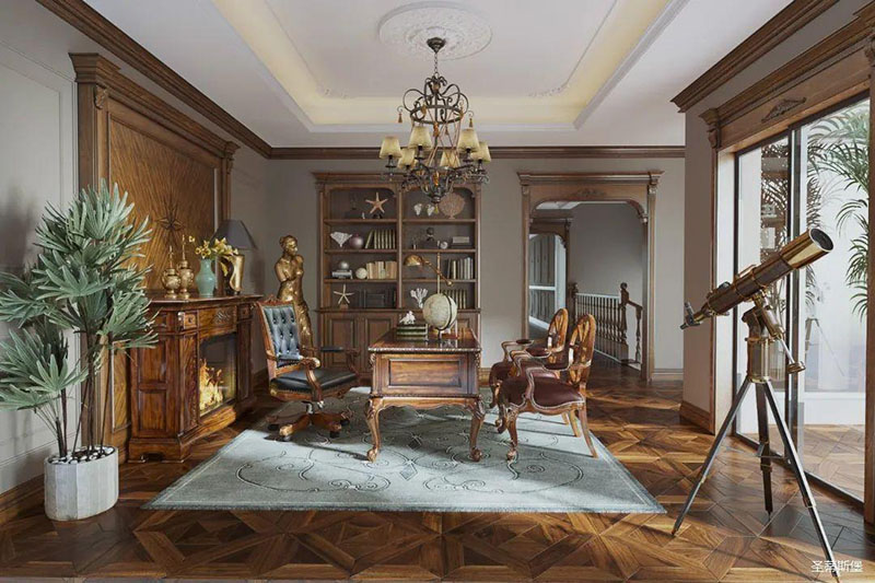 书房护墙板是由白枫木皮拼接的花鬘图案,颜色层次分明,立体感超强,营造了满满的美式镶嵌艺术感。深沉木色边柜在护墙板上延伸,逐渐浸染了古铜色的家具和灯饰,结合着拱形罗马柱,塑造出端雅大方的环境氛围。