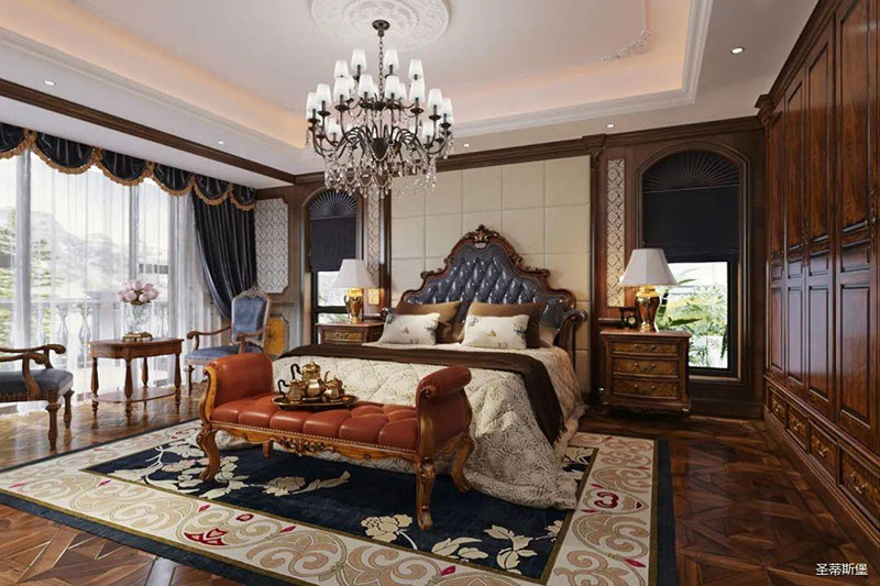主卧置顶复古纹理的实木衣柜,在完善了收纳的同时,极简动线也完整了生活的风貌。深海蓝的高床屏与米色背景碰撞,犹如海水与沙滩相融,置身其中,仿佛与蓝天碧海来了场浪漫自然的邂逅。地毯上精致的古典鲜花纹理,撷取设计师的绝妙巧思,与空间的雕花艺术相呼应,在居家空间里演绎了一场温馨的艺术创作。