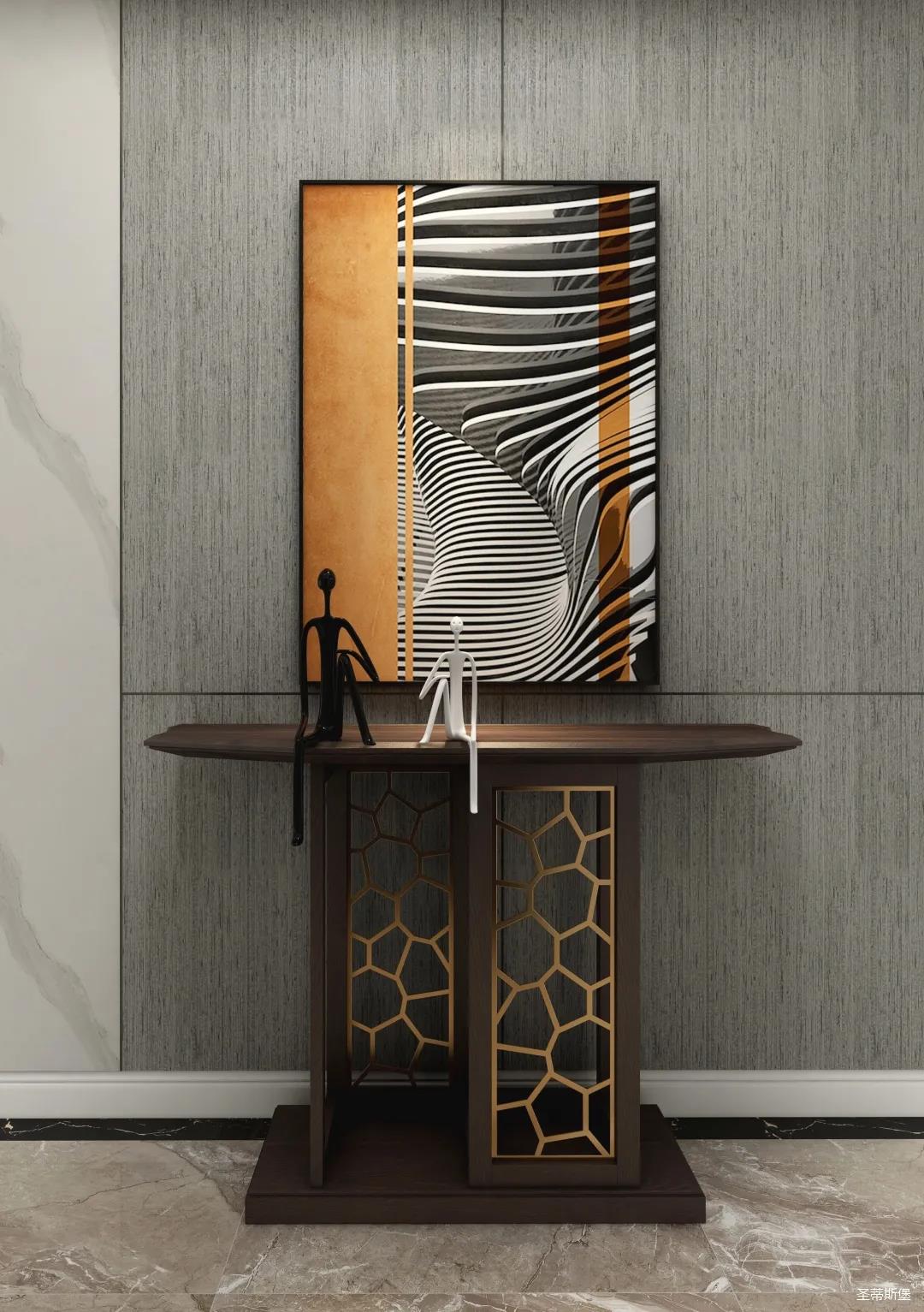 客厅在空间摆设上错落有致,看似不统一的空间,在观感上却给人以整齐划一的感官体验,诺大的客厅区域由于大面积落地窗设计,充满了自然光线,营造明亮和舒适的氛围感,细节的几何型灯具为室内增加照明强度,增添了温馨感。现代的简洁与美式轻奢的气质相结合,散发着沉稳,而又不失清新的优雅格调。
