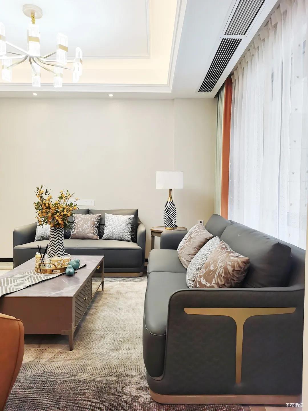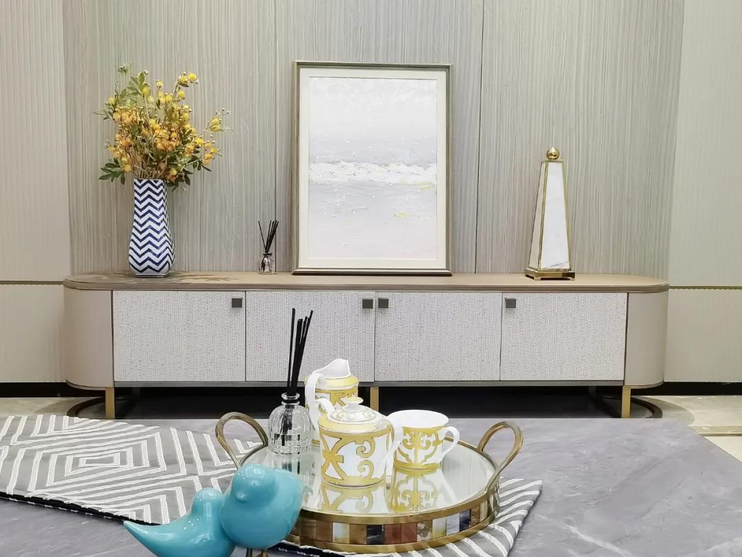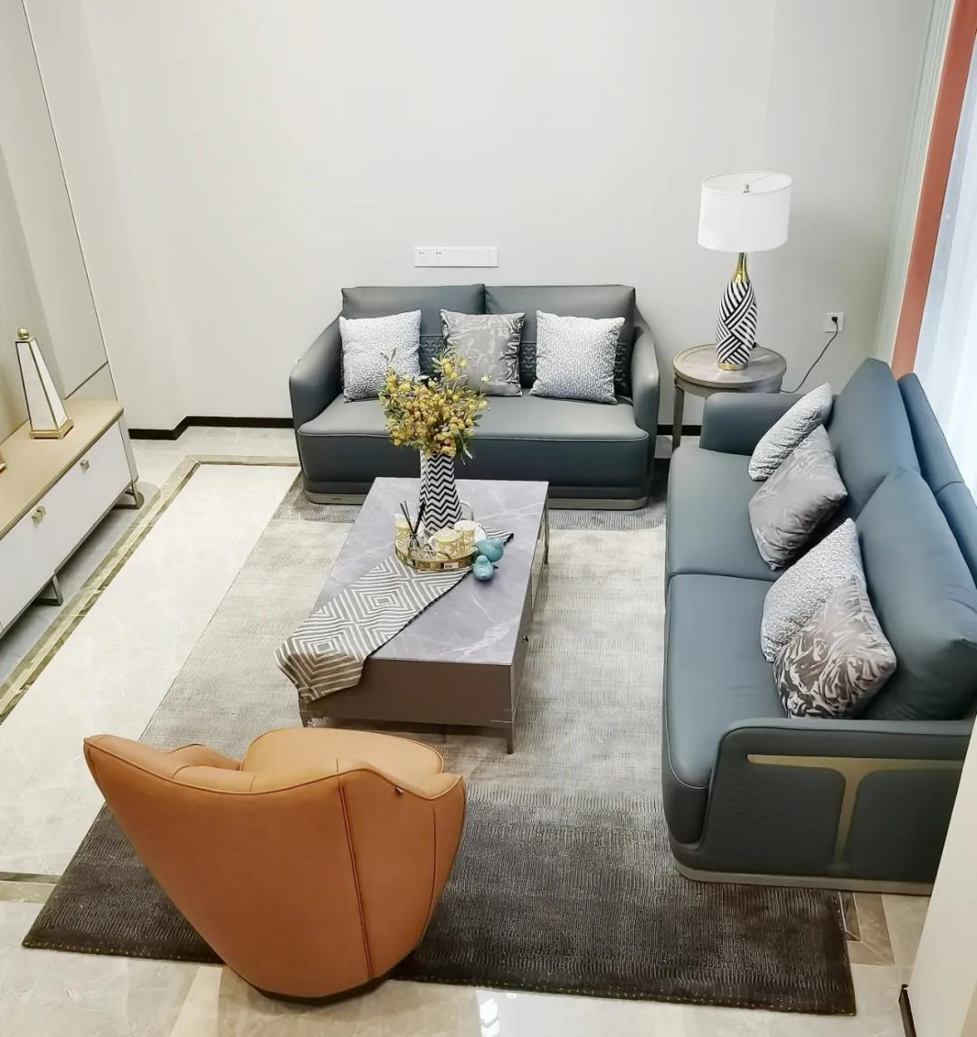 浅灰为基底的饰面与低饱和度的深色沙发相互映衬,产生强烈的视觉冲击,深色的家具让空间从视觉上衍生出一种纵深感。岩玻的质感与真皮编织的纹理尽显现代之美,细节陶瓷摆件注满了空间优雅的艺术氛围。