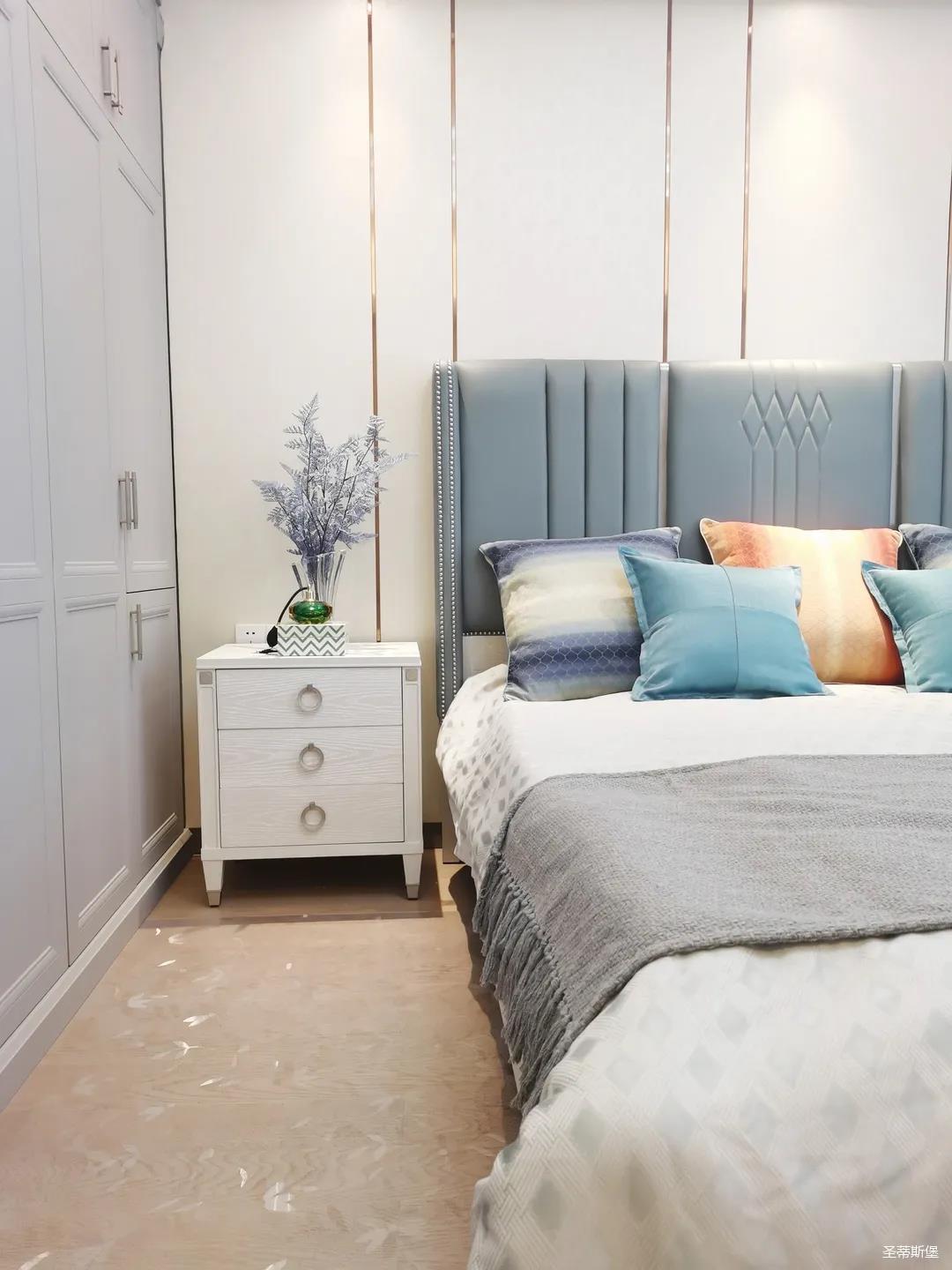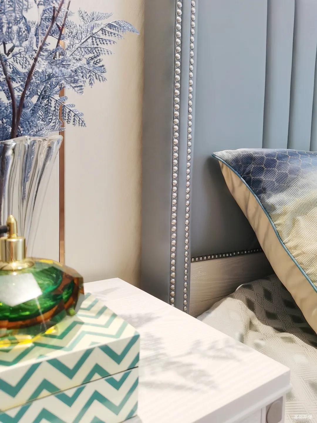 一楼的房间业主是作为长辈房,采用轻奢的背景墙面,结合亮眼的金属线条设计,空间显得时尚又不失沉稳。莫兰迪色的浅蓝床屏,在无主灯设计与自然光线的碰撞下酝酿出不同的光影美感。