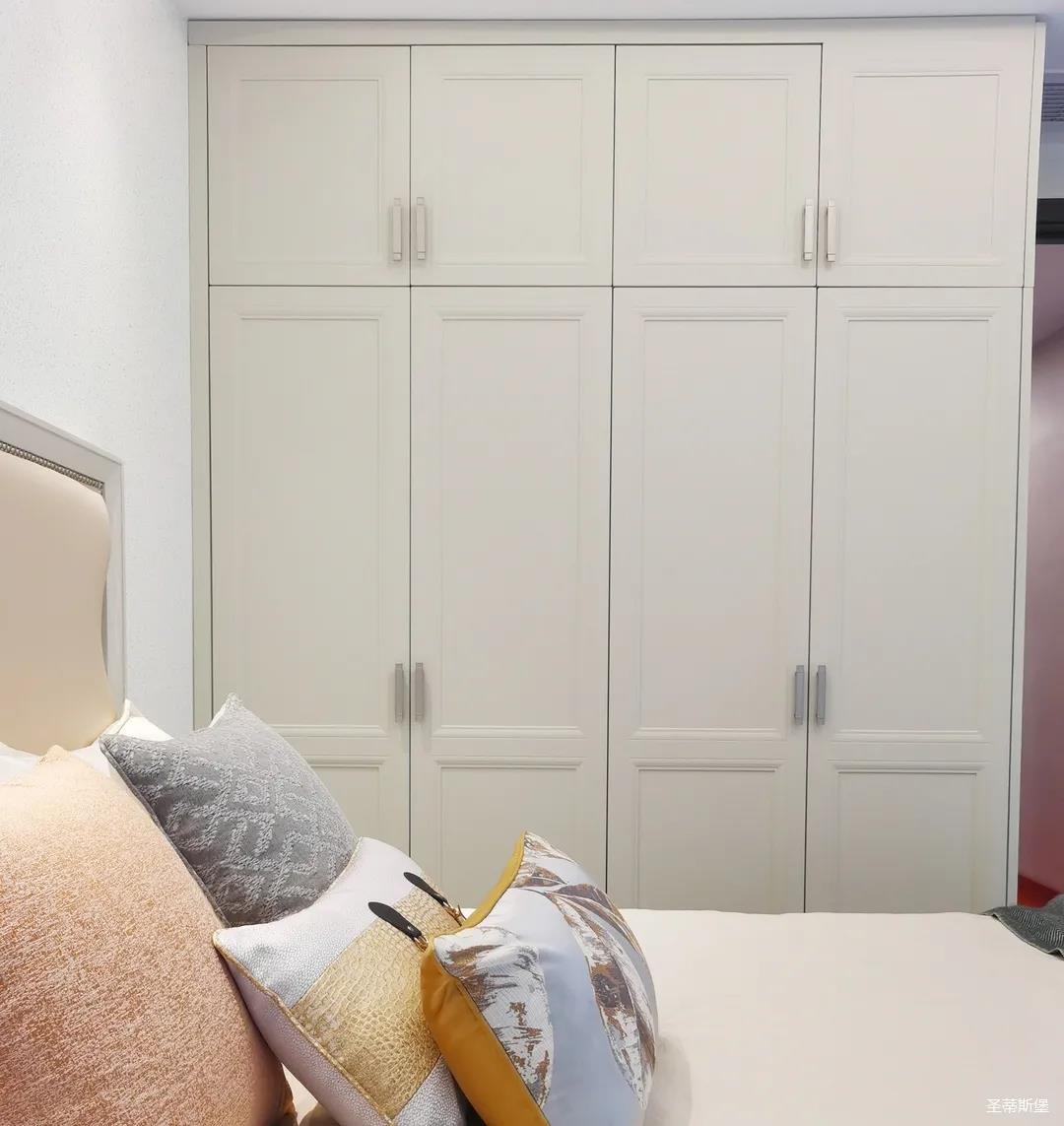 少女粉软包床屏搭配仙气十足的羽翼台灯,让空间显得尤为梦幻。功能与颜值兼具的定制衣柜,与温柔的空间相得益彰,简单优雅的同时也不失童趣。