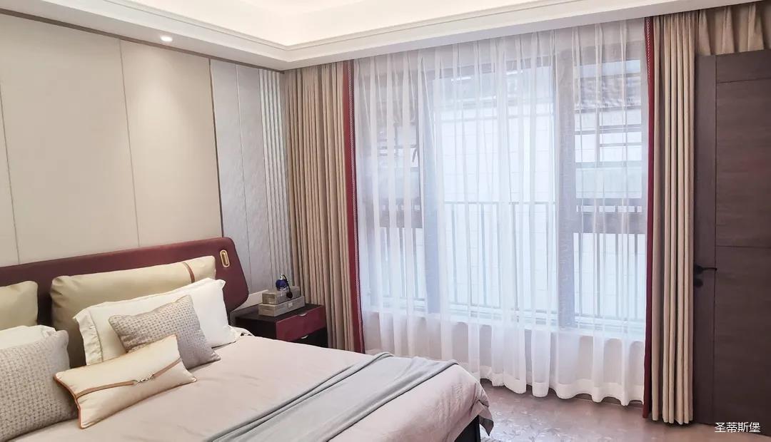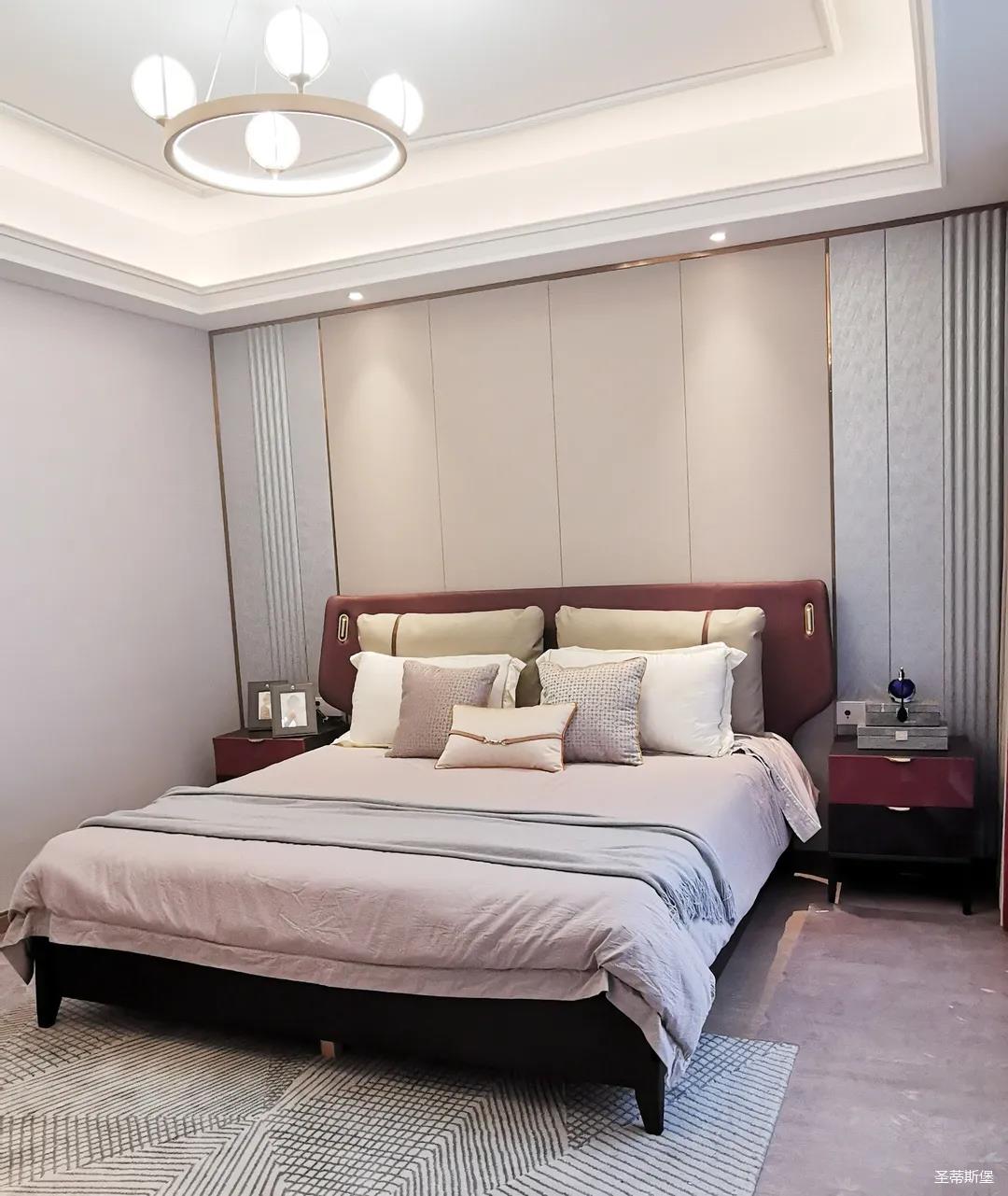 三楼的主人房设计风格更偏向简约,浪漫的酒红色床屏运用了曲面造型,融合了极简主义美学和轻奢元素,小型夜间感应灯设计让每一处细节都充满着时尚优雅的气息。夜间倚靠在厚实的软包上,时光好像在不知不觉中慢了下来,让我们能品味和咀嚼生活的氛围。