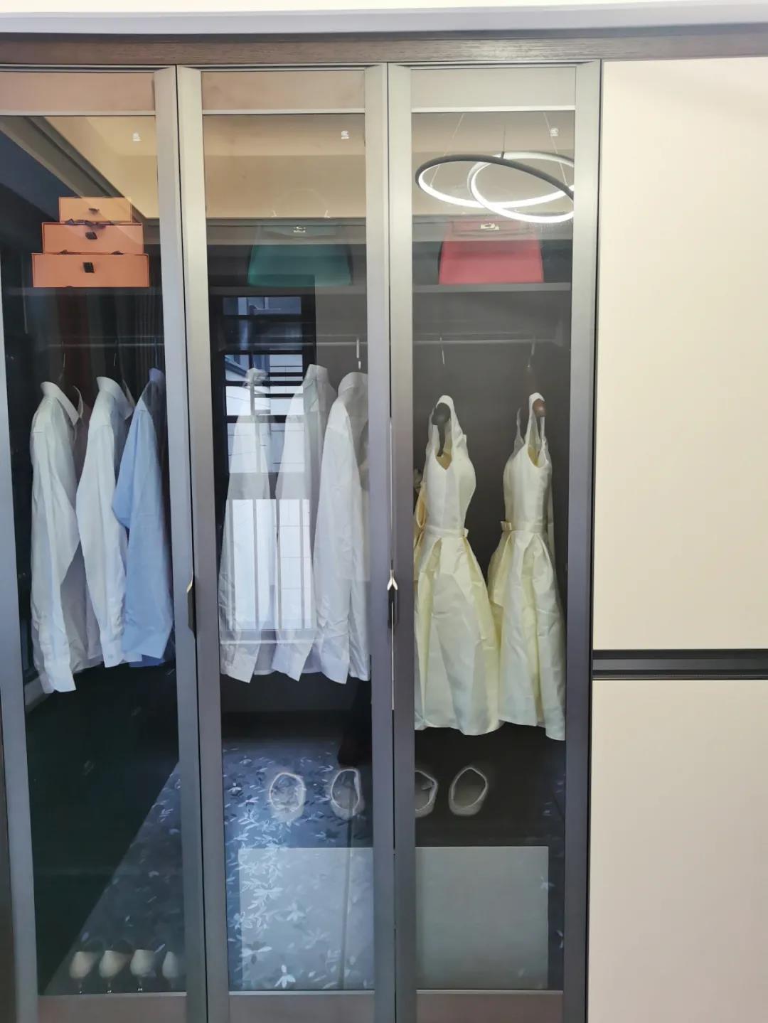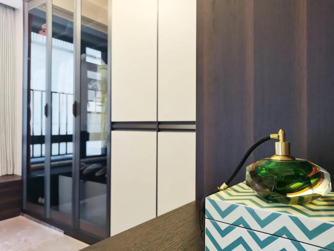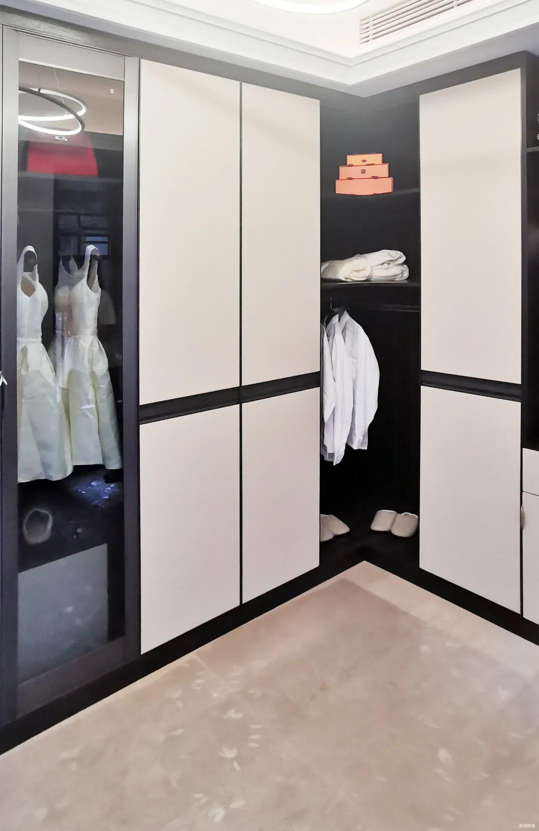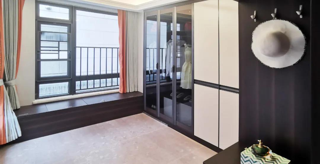 衣帽间以现代极简设计手法引入轻奢元素,借助实木与金属组合打破了传统储物区的沉闷感,烟熏色橡木纹的定制柜体,色泽好似一杯温暖醇香的摩卡,令空间层次感与立体感的格调顿生,予以沉稳舒适感官体验。
