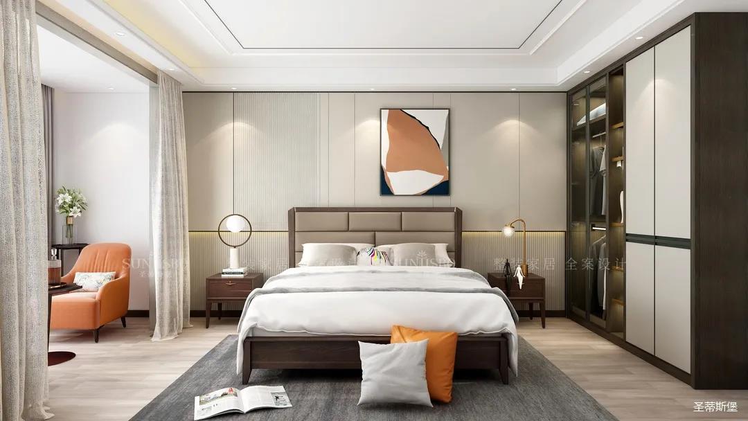 主卧运用了大面积落地窗围合,整体的无主灯设计,凸显了空间极简潮流。无限引入窗外的移动光线,轻松为空间注入阳光的温度,u型极简金属悬置着一个白色造型灯,让空间从静谧中生出无穷的变幻。家具设计偏向简约舒适,造型虽不夺目,但细节质感却能经得起时光的琢磨与品味。
