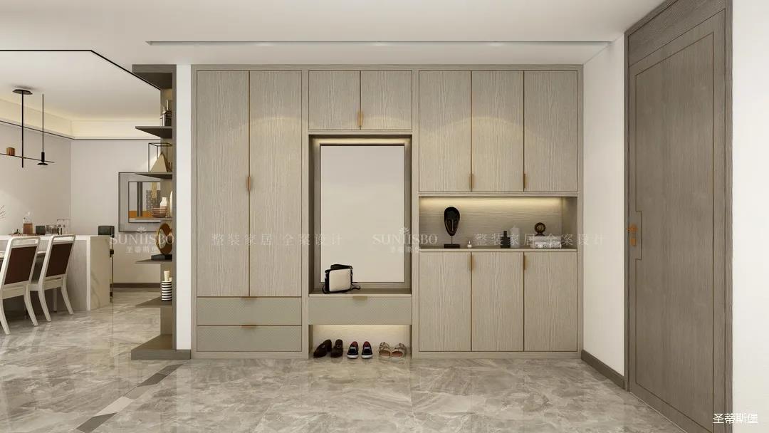 玄关柜采用内嵌式设计,柜体合理分区,可涵盖大量入户闲置物品。