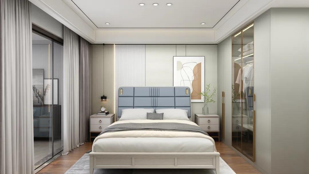 次卧浅灰色的背景墙时尚又内敛,入目尽显舒适的视觉感,为了避免过于单调,特意搭配了与整体保持一致的拼色窗帘,作为空间色彩的点缀。