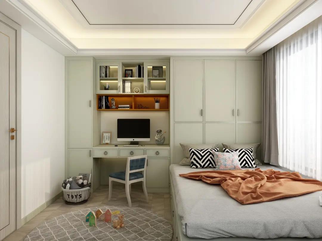 次卧背景墙两端是对称式设计,以淡雅的暖色为主,