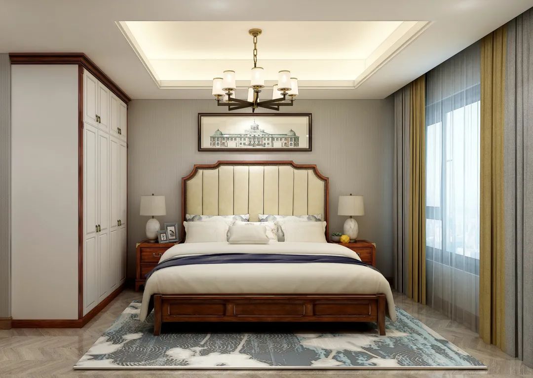 淡蓝色也是冷静色,可以使人更加容易入睡。床屏的边缘采用了铆钉镶嵌,在光线照射下可提亮空间,使床屏看起来更加精致,更有轻奢的高级感。