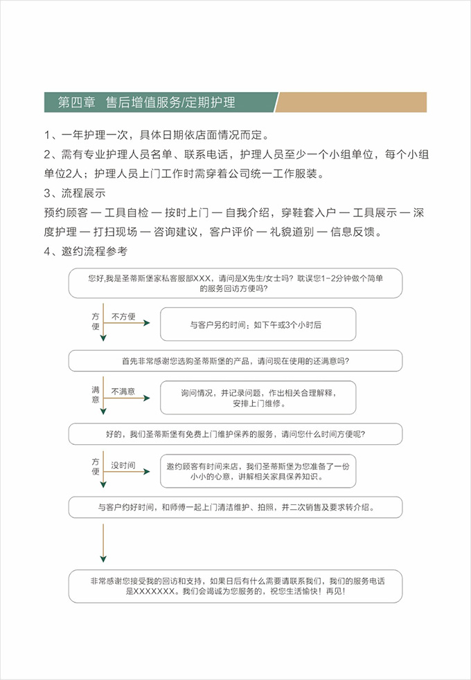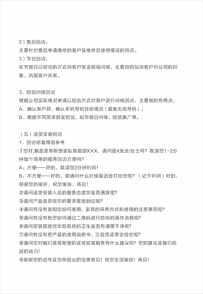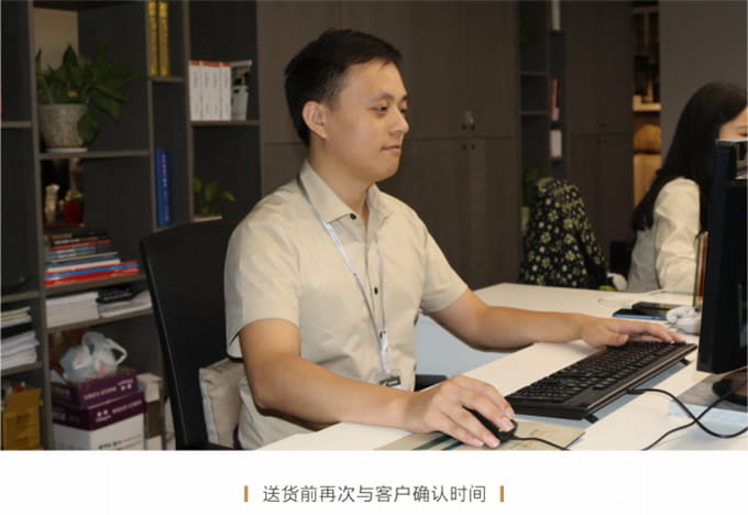 话术参考:“**先生/女士您好,我是米兰·(milan)中国官方网站的售后服务人员**,您购买的米兰·(milan)中国官方网站家具已经全部到货了,送货安装大约需要**时间,请问您这边什么时候方便我们上门送货安装呢?”同时要了解送货小区的电梯、楼道、入户门的尺寸等,提前做好准备,避免意外情况。最后确定送货时间(安装所需要时长),并告知客户安装人员的相关信息,可加微信发送,并发送配送安装流程说明。