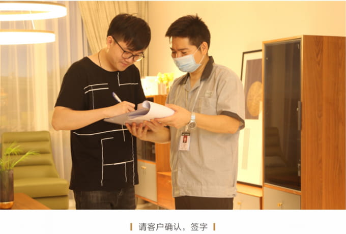 产品处理完毕后必须一站式通检,指导客户使用,并将服务过程中产生的垃圾随手带走,家具维修完毕后,应用毛巾将家具擦拭一遍,确保产品清洁。